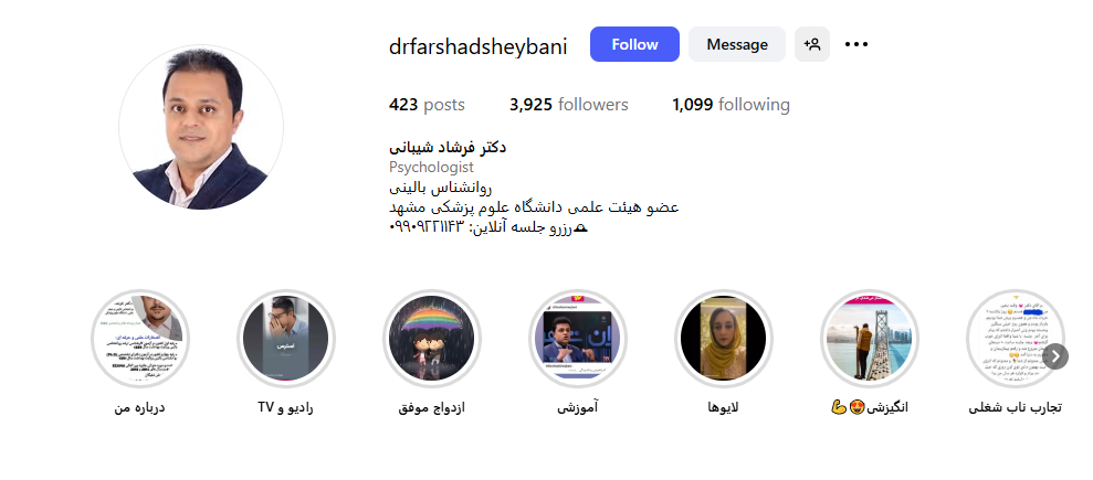 دکتر فرشاد شیبانی دانشجوی دکتری روانشناسی بالینی دانشگاه علوم پزشکی ایران، کارشناسی ارشد روانشناسی بالینی دانشگاه علوم پزشکی تهران، کارشناس روانشناسی بالینی دانشگاه خوارزمی تهران، کارشناس برنامه های تالویس، کارشناس برنامه های رادیویی، مدرس دانشگاه های علوم پزشکی تهران و ایران. وی اکنون استاد کارگاه های روانشناسی و مجتمع فرهنگی هنری شهرداری تهران، مدرس کارگاه های مهارت های زندگی برای مدیران پایه دانشگاه علوم پزشکی ایران و همچنین عضویت در بنیاد ملی نخبگان، عضویت استعدادهای درخشان دانشگاه است. تهران. علوم پزشکی.